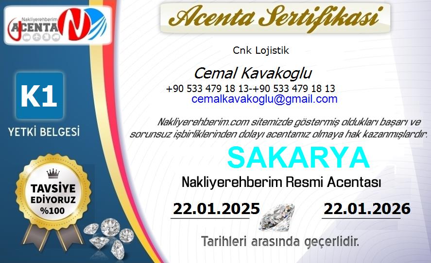 CNK LOJİSTİKSAKARYA / ADAPAZARI Cemal Kavakoglu +90 533 479 18 13 +90 533 479 18 13 cemalkavakoglu@gmail.com www.cnklogistic.com |